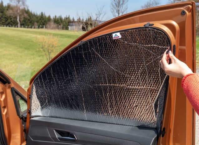 Das ISOLITE Inside Isolierung Fahrerhaus-Seitenfenster VW Caddy 5 / Caddy California passt genau und muss nicht an die Scheibe gehängt werden, sondern wird am Fensterrahmen mit Klettverschluss so angebracht. So kann die eingeschlossene Luft zwischen Scheibe und ISOLITE nicht zirkulieren und nach oben (Sommer) oder unten (Winter) entweichen. Es entsteht die Wirkung einer Doppelverglasung.